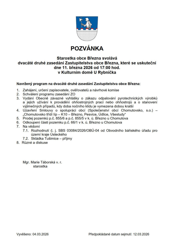 Pozvánka na veřejné zasedání Zatuspitelstva obce Březno dne 11.03.2026