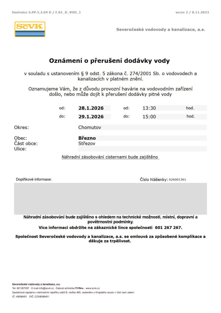 Oznámení o přerušení dodávky vody v lokalitě – Střezov